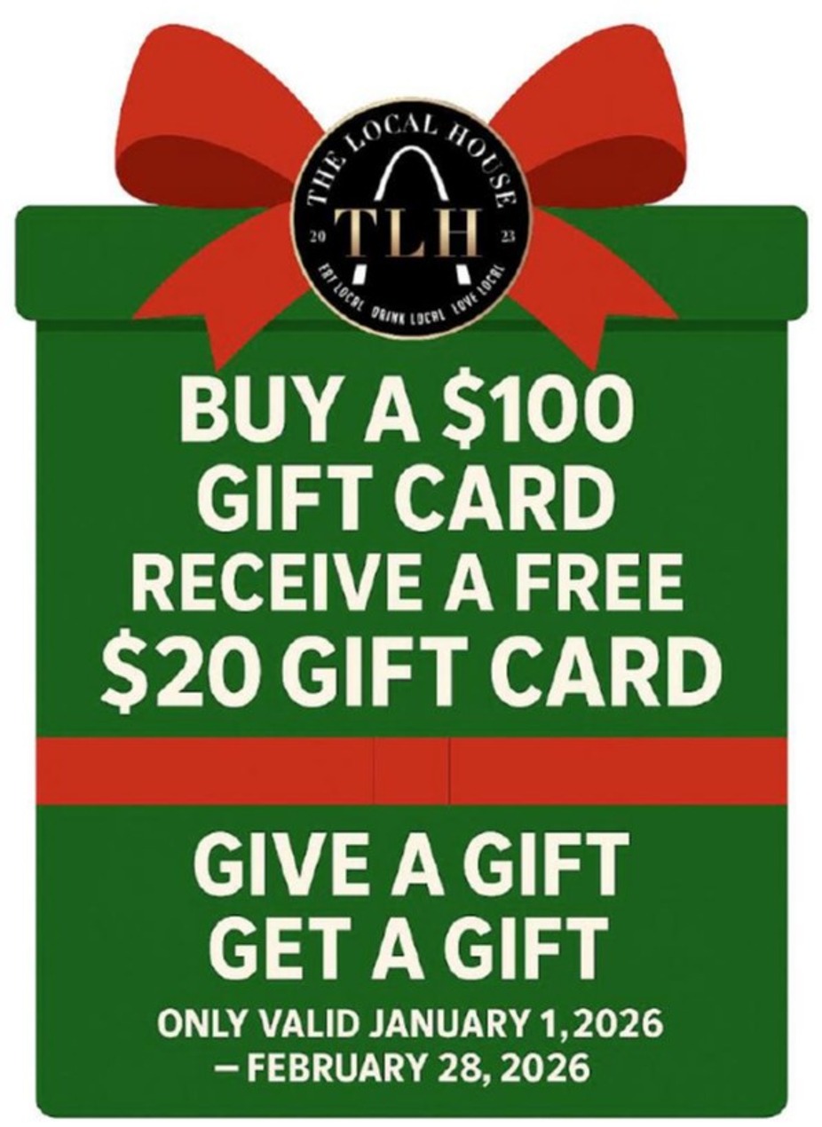 It's that time of the year again! Today kicks off our Gift Card Promotion. Buy a $100 in Gift Cards now till December 31st and receive an additional $20 card that can be used from January 1st - February 28th 2026.
